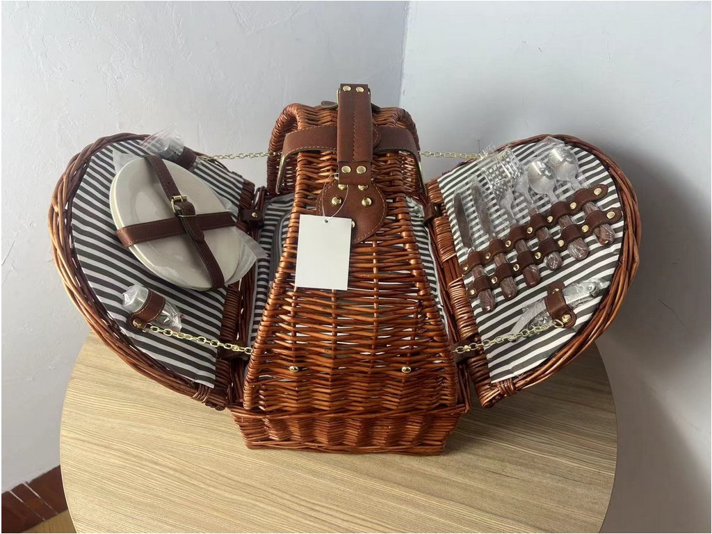 V koši se ukrývá sada nádobí pro 2 osoby – lžíce, vidlička, nůž s plastovou rukojetí v imitaci dřeva, plastová sklenička a keramický dezertní talíř. Nechybí ani otvírák na láhve s vývrtkou a solnička s pepřenkou z nerezu.